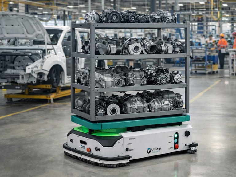 CabraMove helps manufacturers automate repeatable material movement using autonomous mobile robots (AMRs). Our systems support towing, pallet movement, line feeding, and point-to-point delivery in real industrial environments.
